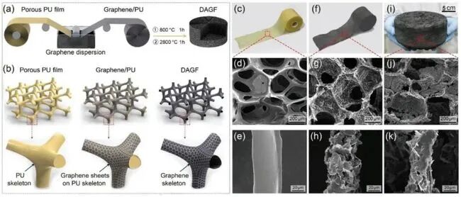 图1 (a)石墨烯框架的制备流程和(b)相应的结构变化。(c–e)多孔PU膜,(f–h)石墨烯/PU,(i–k)石墨烯框架的光学和SEM图像。