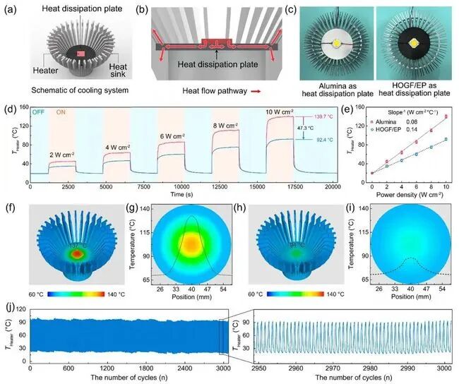 图8 复合材料作为散热板的实际工况(a)示意图、(b)热流路径和(c)实物图,并用商用的氧化铝散热板做对比。(d)温度随时间的变化曲线和(e)稳态温度与功率密度的函数。基于有限元分析的(f, g)氧化铝和(h, i)复合材料的模拟温度分布
