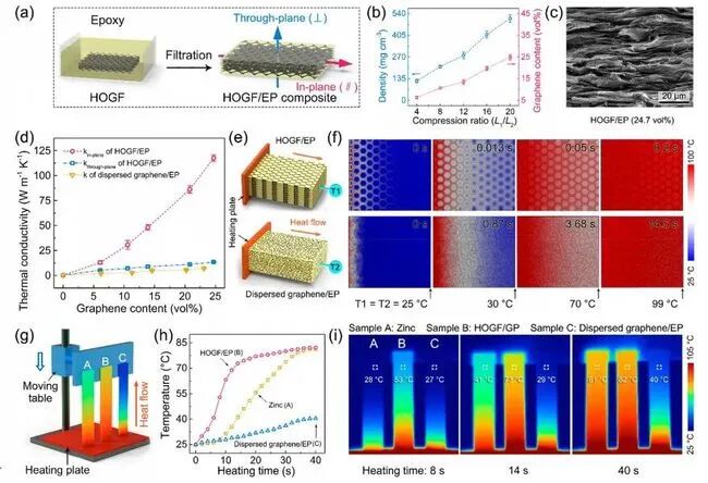 图6 (a)石墨烯框架/环氧复合材料的制备流程。(b)石墨烯框架密度和相应体积分数与压缩比的关系。(c)复合材料的断面SEM图像和(d)横/纵向的热导率。石墨烯框架/环氧和分散石墨烯/环氧的(e)仿真模型和(f)瞬态温度分布以及实际传热测试(g)示意图、(h)温度变化曲线和(i)红外热像图。