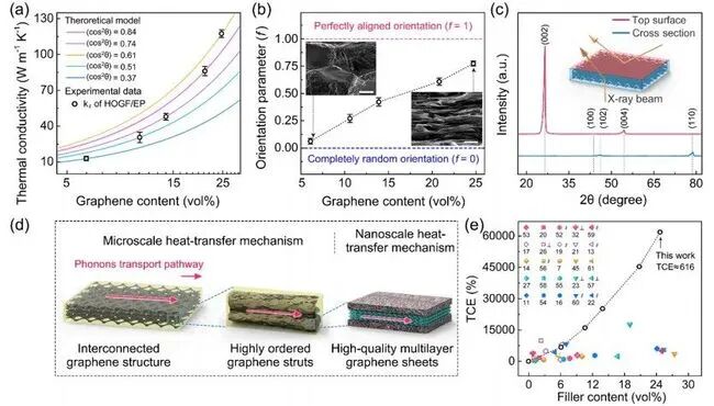 图7 (a)利用金属泡沫理论拟合实验热导率。(b)复合材料取向参数与石墨烯含量的关系。(c)复合材料 (24.7 vol %)顶面和横截面的XRD图。(d)复合材料的传热机理。(e)本文复合材料的TCE与以往文献对比