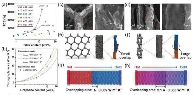 为了解决上述问题,中科院宁波材料所提出了一种多尺度结构调控过程的双组装策略,来构建各向异性的石墨烯框架。该石墨烯框架不仅具有沿垂直方向的高度定向排列,而且其内部的相邻石墨烯片之间紧密接触,结点热阻较低。因此,该石墨烯框架与聚合物的复合材料表现出了出色的导热性增强效果。石墨烯框架与环氧树脂的复合材料拥有62.4 W m−1 K−1(≈ 13.3 vol%)的纵向热导率,比纯环氧树脂高325倍,使其具有超过2,400%的超高TCE。这一工作为设计高性能导热复合材料提供了有益指导,并提高了其在热管理中实际应用的可能性。