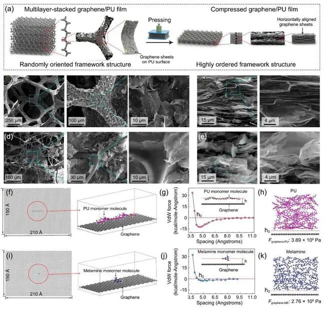 图5 (a)压力使石墨烯/聚合物复合框架形成高度取向结构示意图。(b)未压缩石墨烯/PU框架和(c)压缩制备的石墨烯框架的SEM图像。(d)未压缩石墨烯/三聚氰胺框架和(e)压缩制备的石墨烯框架的SEM图像。计算石墨烯与PU之间范德华力的(f)仿真模型及(g, h)结果。计算石墨烯与三聚氰胺之间范德华力的(i)仿真模型及(j, k)结果。