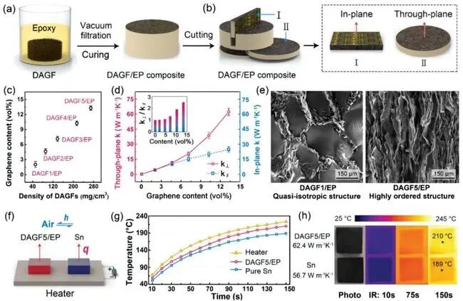 图3 (a–b)石墨烯/环氧复合材料的制备流程。(c)石墨烯的体积分数与石墨烯框架密度的关系。(d)复合材料横/纵向的热导率。(e)不同拉伸率下制备的复合材料的断面SEM图像。复合材料和金属锡的(f)导热测试装置示意图、(g)温度变化曲线、(h)红外热成像图