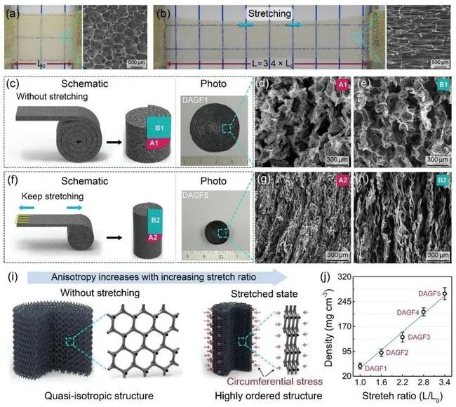 图2 (a)未拉伸和(b)拉伸的多孔PU膜的照片和SEM图像。使用未拉伸和拉伸PU多孔膜制备的石墨烯框架的(c, f)原理图、照片、(d, g)俯视的图和(e, h)断面SEM图像。(i)拉伸调节石墨烯框架高度有序排列的示意图。(j)石墨烯框架密度和拉伸比的关系。