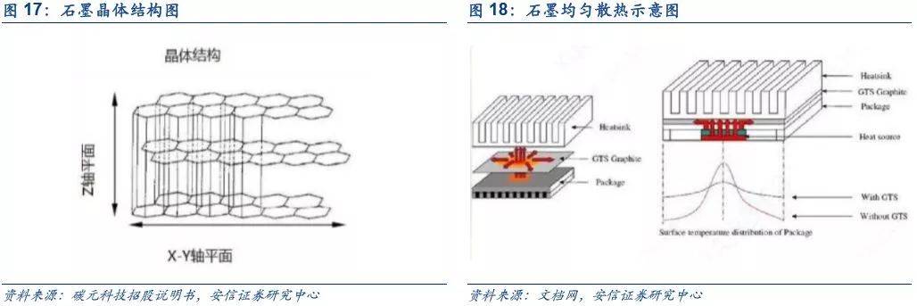 主流散热材料,单手机用量为 3~6 片石墨是相较于铜和铝等金属更好的导热材料,主要原因在于石墨具有特殊的六角平面网状结构,可以将热量均匀地分布在二维平面并有效地转移。在水平方向上,石墨的导热系数为 300~1900W/(m〃K),而铜和铝的导热系数约为 200~400 W/(m〃K)。在垂直方向上,石墨的导热系数仅为 5~20W/(m〃K)。因此,石墨具备良好的水平导热、垂直阻热效果。同时,石墨的比热容与铝相当,约为铜的2倍,这意味着吸收同样的热量后,石墨温度升高仅为铜的一半。