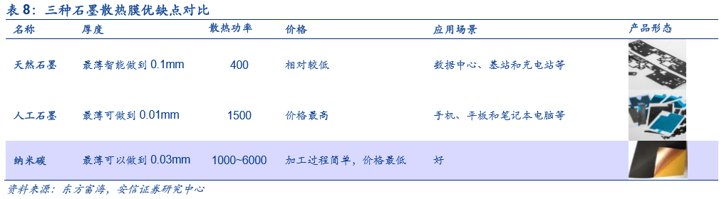 (3)纳米碳散热膜:由纳米碳(石墨同素异构体)制成,最薄可做到 0.03mm,散热功率可 高达 1000~6000。由于纳米碳散热膜加工工序简单,只需要开模和冲切,成本低售价也低。