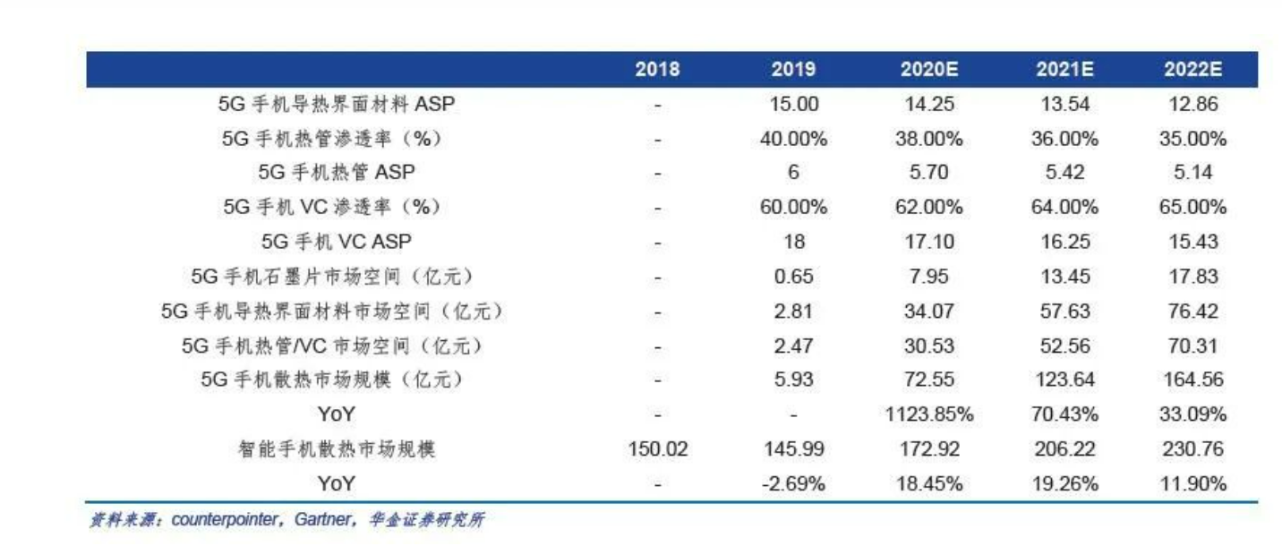 手机散热市场将随单机价值量提升和5G手机出货量提升,迎来百亿规模增量市场空间。未来随着5G手机渗透率提升和散热方案的升级,按照华金证券数据,全球手机散热市场有望从2019 年的150亿元增长到2022年的230亿元。